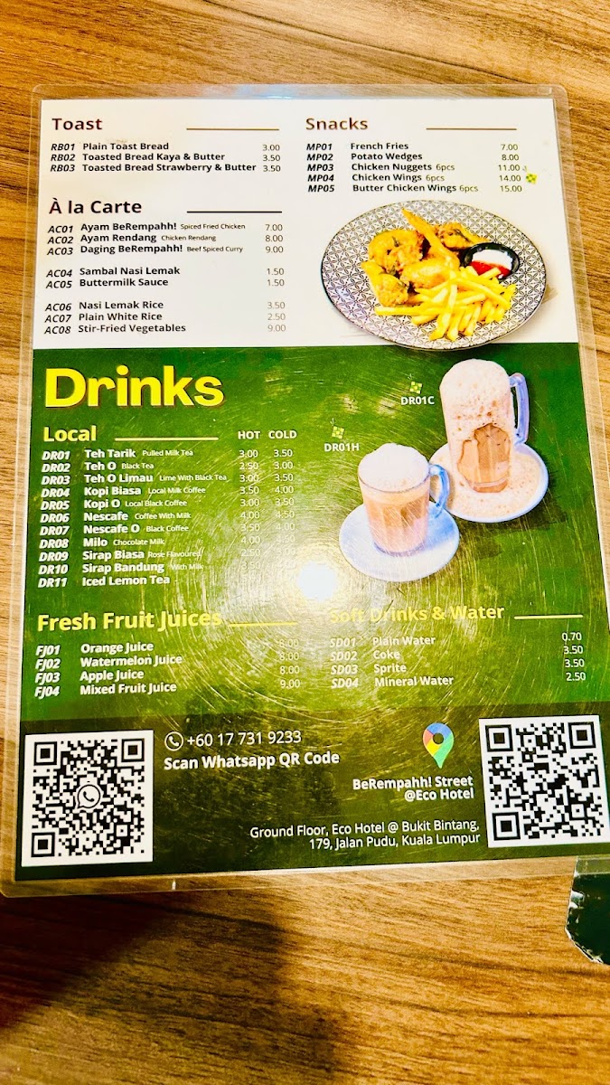 Welcome to BeRempahh! Street @Eco Hotel, a hidden gem nestled in the bustling heart of Kuala Lumpur at 179, Jln Pudu. This cozy eatery is perfect for food lovers seeking authentic local flavors. The menu features delightful choices like Nasi Goreng BeRempahh and rich butter chicken chop, guaranteed to satisfy your cravings. Customers rave about the generous portions and affordable prices, making it a great spot for a hearty meal without breaking the bank.